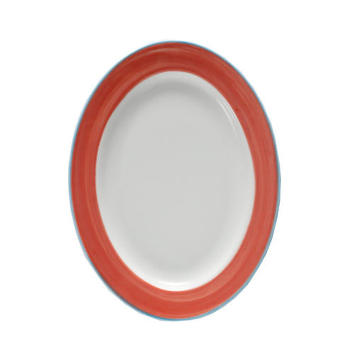 Platter, 12" x 9", oval, rimmed, rolled edge, scratch/chip resistant, microwave, dishwasher & oven safe up to 380°F, porcelain, blue edge, Corona, Calypso, Coral (Stocked Item)