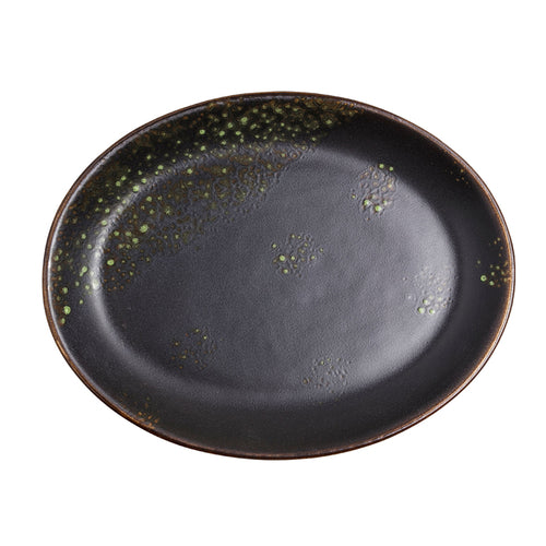Platter, 11", oval, coupe, hand painted, fully glazed foot, scratch resistant, aluminum oxide reinforced body, porcelain, matte black/jade reactive glaze, Premium, London Moonstone Collection