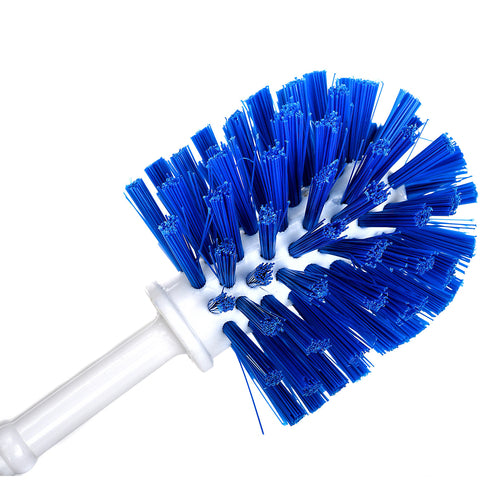 Economy Toilet Bowl Brush, 16-3/10"L, plastic handle, with round caddy, contoured, non-slip grip, chemical resistant, polypropylene bristles, blue/white