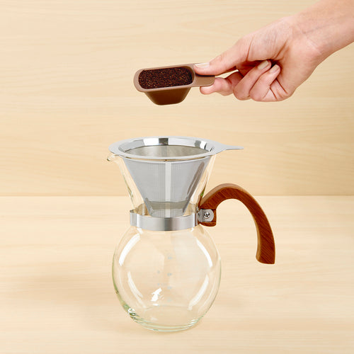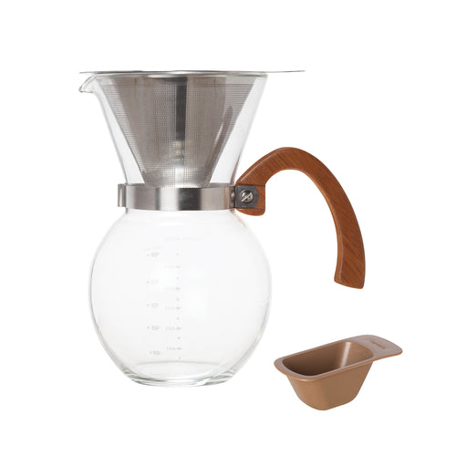 HIC Coffee Maker Set, pour-over, includes: (1) 22 oz. (4-servings) borosilicate glass coffee maker with bamboo handle & stainless steel collar, (1) reusable stainless steel filter with fie-mesh liner & (1) coffee scoop, water level markings, high heat, break/shock resistant (boxed)