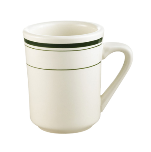 Greenbrier Ventura Mug, 8 oz., 3-1/8" dia. x 4"H, round, tall, dishwasher, oven and microwave safe, stoneware (ceramic), Green Band/American White (Sold by case)