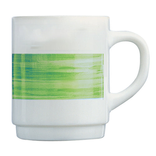 Mug, 8 oz., 3-1/2"H, stackable, fully tempered, microwave safe, glass, Arcoroc, Opal®, Brush Green, white with green stripe