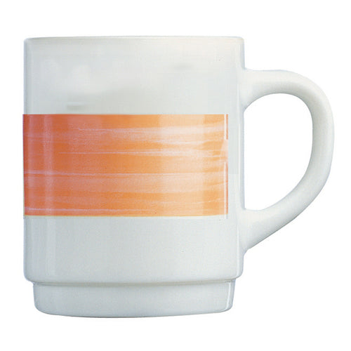 Mug, 8 oz., 3-1/2"H, stackable, fully tempered, microwave safe, glass, Arcoroc, Opal®, Brush Orange, white with orange stripe