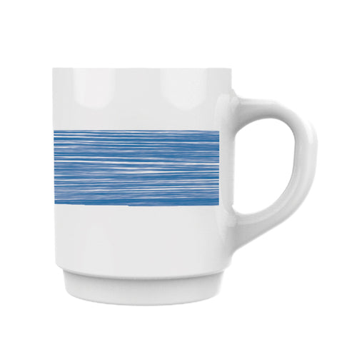 Mug, 8 oz., 3-1/2"H, stackable, fully tempered, microwave safe, glass, Arcoroc, Opal®, Brush Blue Jean, white with dark blue stripe