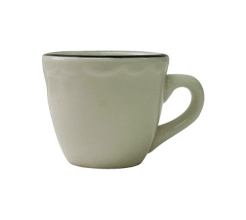 Cup, tall, 7-1/2 oz., 4" dia. x 2-1/2"H, round, scalloped edge, microwave & dishwasher safe, lead free, ceramic, American White with black band, Sydney™