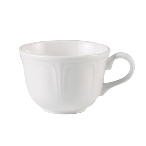 Tulip Cup, 8 oz., round, with handle, embossed rim, scallop edge, microwave, oven and freezer safe, vitrified china, white, Steelite Distinction, Monique (minimum = case quantity) (stock item)