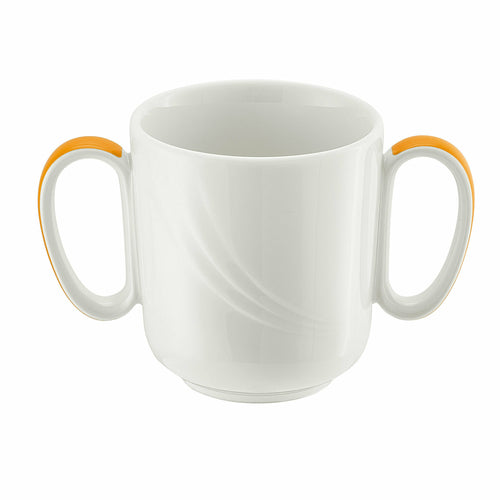 Mug, 10-1/2 oz., (H 3-3/8"; T 3-1/4"; F 2-1/8"), 2-handle, stackable, porcelain, Donna Senior pattern, Schonwald, Continental White™ with orange band (6 each per case)