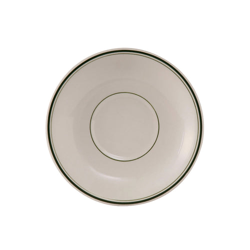 Saucer, 6" dia., round, coupe, wide rim, rolled edge, microwave & dishwasher safe, oven proof, fully vitrified, lead-free, ceramic, Green Bay, American White/Eggshell with Green Band