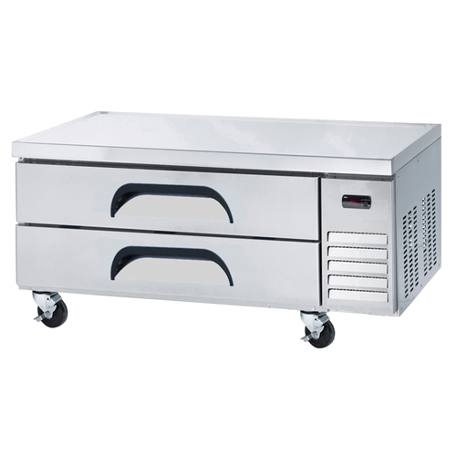 Refrigerated Chef Base Equipment Stand, 48"W, side-mounted self-contained refrigeration, stainless steel flat top, (2) drawers, digital thermometer, automatic defrost, stainless steel interior, stainless steel front & sides, (4) 4"H swivel casters (2 braked), R290 Hydrocarbon refrigerant, 1/4 HP, 115v/60/1-ph, 3 amps, cord with NEMA 5-15P, cETLus, ETL-Sanitation