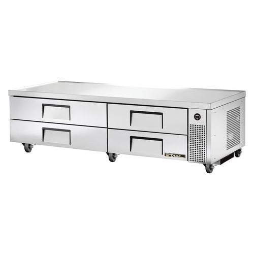 Refrigerated Chef Base, 82-3/8"W base, one-piece 300 series 18 gauge stainless steel top with V edge, (4) drawers (left drawer accommodates (3) and right drawer accommodates (2) 12" x 20" x 4" pans, NOT included), stainless steel front/sides, aluminum back, aluminum interior with stainless steel floor, 4" castors, 1/3 HP, 115v/60/1-ph, 10.3 amps, NEMA 5-15P, cULus, UL EPH Classified, CE, Made in USA