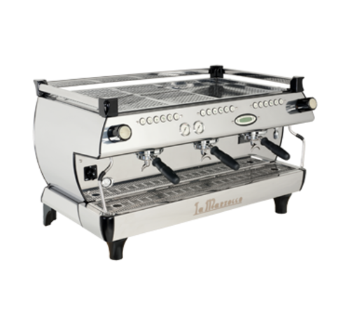 La Marzocco GB5 AV Espresso Machine, 3 group, automatic, programmable coffee dosage, (2) boilers, 5L espresso boiler, 11L steam boiler, PID coffee brew temperature control, (2) steam wands, (1) hot water tap with economizer, polished stainless steel body, 208-240v/60/1, 6100 watts, 28.0 amps, cord requires NEMA 6-50P, NSF, UL/ETL listed