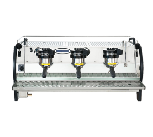 La Marzocco Strada EE Espresso Machine, 3 group, semi-automatic manual dosage, (4) insulated boilers, 1.3L x 3 espresso boilers, 8.2L steam boiler, PID coffee brew temperature control, (2) steam wands, (1) hot water tap with economizer, stainless steel body panels with black finish trim, 208-240v/60/1-ph, 6700 watts, 30.0 amps, cord requires NEMA 6-50P, NSF, UL/ETL listed