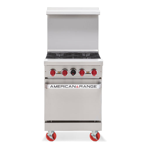 Culinary Series Heavy Duty Restaurant Range, gas, 24", (4) 32,000 BTU step-up open burners, (1) Innovection oven, (1) rack, stainless steel front, sides & high shelf, 6" adjustable chrome plated legs, 46.0kW, 155,000 BTU, ETL-Sanitation, Made in USA