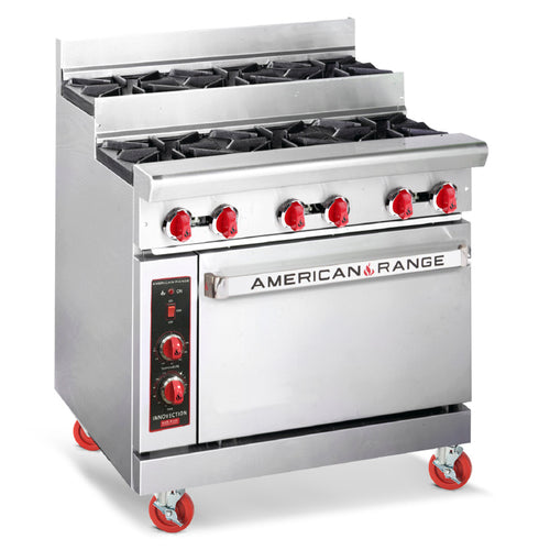 Heavy Duty Restaurant Range, gas, 36", (3) 32,000 BTU open burners, (3) 32,000 BTU step-up open burners, 26-1/2" standard oven, includes (1) rack, unit comes standard with 6" stub back, stainless steel front & sides, 6" chrome plated legs, 66.0kW, 227,000 BTU, ETL-Sanitation, Made in USA