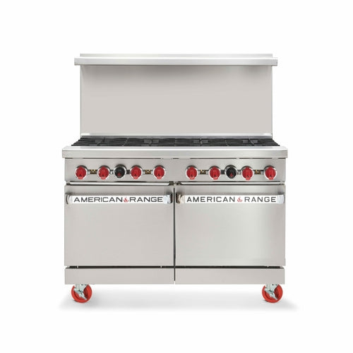 Heavy Duty Restaurant Range, gas, 72", (8) 32,000 BTU open burners with 18" wide heavy duty grates, (2) 26-1/2" ovens with one rack each, stainless steel front, sides & high shelf, 6" chrome plated legs, 96.0 kw 326,000 BTU, ETL, Made in USA