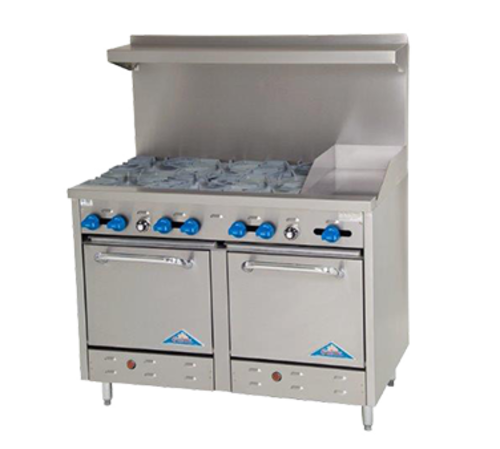 Range, gas, 48" wide, (6) 24,000 BTU star burners with 12" square cast iron grates, (1) 12" - 3/4" thick griddle with manual controls, (2) space-saver ovens with enamel door & bottom linings, (1) rack per oven with 3 positions, stainless steel exterior & high shelf, 6" stainless steel legs, 37" tall to cook surface, 214,000 BTU, NSF, cETLus
