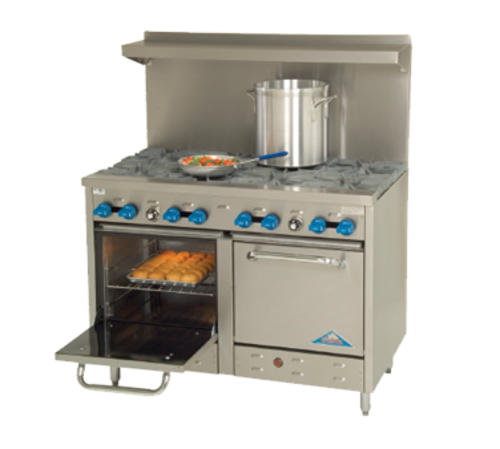 Range, gas, 48" wide, (8) 24,000 BTU star burners with 12" square cast iron grates, (2) space-saver ovens with enamel door & bottom linings, (1) rack per oven with 3 positions, stainless steel exterior, with high shelf, 6" stainless steel legs, 37" tall to cook surface, 242,000 BTU, NSF, cETLus