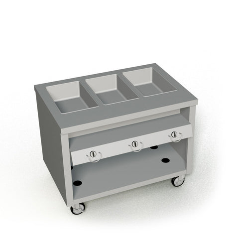 Thurmaduke™ Hot Food Unit, gas, 46"W x 32"D x 36"H, 16ga stainless steel top, (3) stainless steel dry heat wells, (3) stainless steel water pans, safety pilots, gas regulator, valve controls, dish shelf, 20ga stainless steel body & undershelf, 6"H stainless steel legs with adjustable feet, CSA STAR, UL EPH Classified