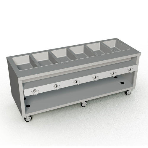 Thurmaduke™ Hot Food Unit, gas, 88"W x 32"D x 36"H, 16ga stainless steel top, (6) stainless steel dry heat wells, (6) stainless steel water pans, safety pilots, gas regulator, valve controls, dish shelf, 20ga stainless steel body & undershelf, 6"H stainless steel legs with adjustable feet, CSA STAR, UL EPH Classified