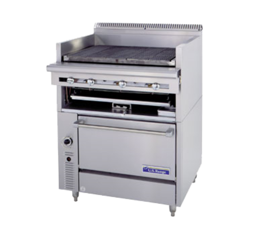 Cuisine Series Heavy Duty Range, gas, 24", charbroiler/broiler, cast iron radiants, adjustable top grates, underfired, standard depth, 6" backguard, stainless steel front and sides, cabinet base, 6" adjustable legs, 72,000 BTU , CSA Flame, CSA Star, NSF (US Range)