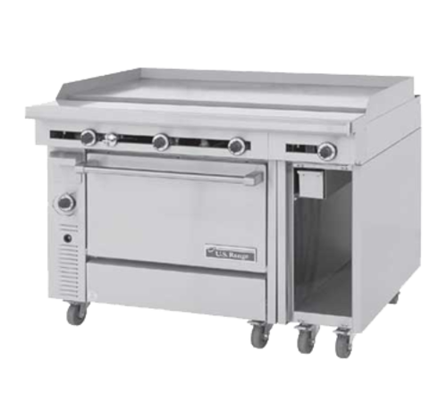Cuisine Series Heavy Duty Range, gas, 48", (1) 48" griddle with 1" thick steel plate, thermostatic controls, standard depth, 6" backguard, stainless steel front and sides, (1) standard oven (1) storage area base, 6" adjustable legs, 160,000 BTU , CSA Flame, CSA Star, NSF (US Range)
