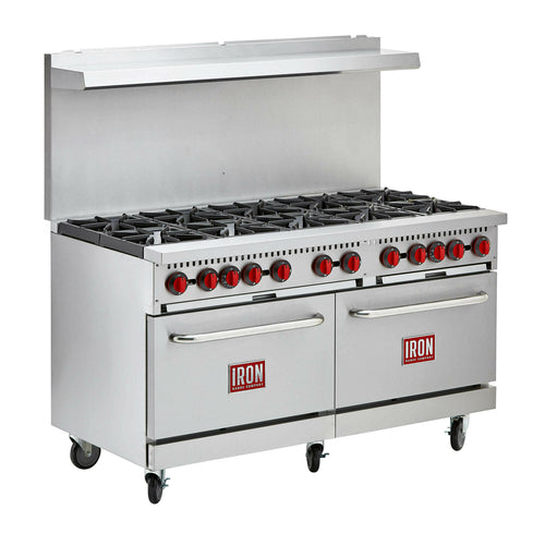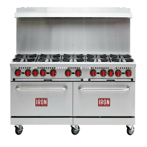 Commercial Range, natural gas, 60"W, (10) 30,000 BTU open burners, removable cast iron grates, (2) standard ovens, (2) adjustable oven racks per oven, adjustable thermostat, removable crumb tray, 250°F to 550°F temperature range, stainless steel front, sides, backriser, & shelf, 6" swivel casters, 360,000 BTU, cETLus, ETL-Sanitation (ships with LP conversion kit)