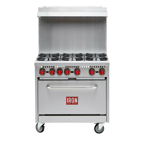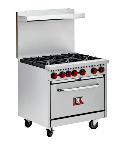Commercial Range, natural gas, 36"W, (6) 30,000 BTU open burners, removable cast iron grates, (1) standard oven, (2) adjustable oven racks, adjustable thermostat, removable crumb tray, 250°F to 550°F temperature range, stainless steel front, sides, backriser, & shelf, 6" swivel casters, 210,000 BTU, cETLus, ETL-Sanitation (ships with LP conversion kit)