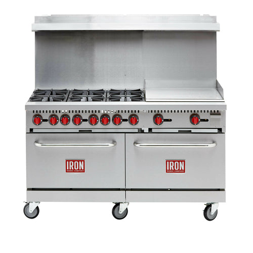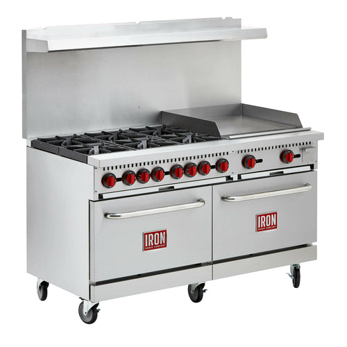 Commercial Range, natural gas, 60"W, (6) 30,000 BTU open burners, 24" griddle, 3/4" thick plate, 4" wide grease trough, 4" welded griddle side shields, removable cast iron grates, (2) standard ovens, (2) adjustable oven racks per oven, adjustable thermostat, removable crumb tray, 250°F to 550°F temperature range, stainless steel front, sides, backriser, & shelf, 6" swivel casters, 276,000 BTU, cETLus, ETL-Sanitation (ships with LP conversion kit)