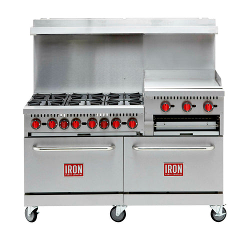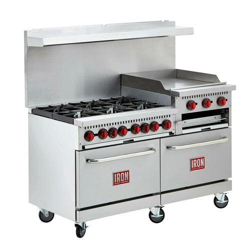 Commercial Range, natural gas, 60"W, (6) 30,000 BTU open burners, 24" raised griddle/broiler, 3/4" thick plate, 4" wide grease trough, 4" welded griddle side shields, removable cast iron grates, (2) standard ovens, (2) adjustable oven racks per oven, adjustable thermostat, removable crumb tray, 250°F to 550°F temperature range, stainless steel front, sides, backriser, & shelf, 6" swivel casters, 276,000 BTU, cETLus, ETL-Sanitation (ships with LP conversion kit)