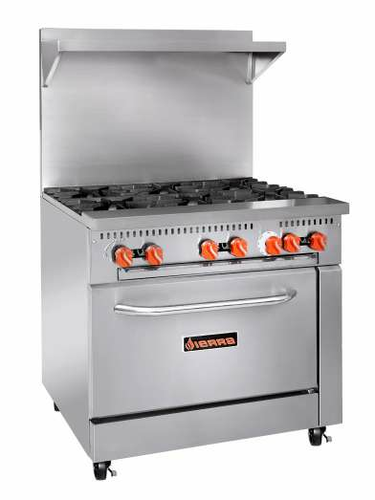 Sierra Range, natural, gas, 36", (6) 25,000 BTU open burners, cast iron top grates, manual controls, (1) 35,000 BTU standard oven with double-sided enamel oven cavity, adjustable oven thermostat, back riser with shelf, stainless steel front & sides, galvanized back, (4) 6" adjustable legs, pressure regulator, 185,000 BTU total, cETLus, ETL-Sanitation (ships with LP conversion kit)
