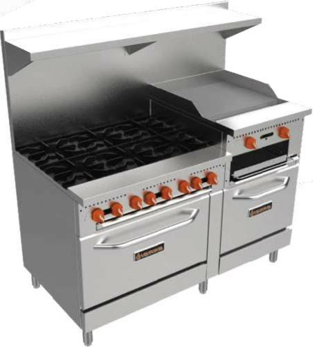 Sierra Range, natural gas, 60", (6) 25,000 BTU open burners, manual controls, (1) 60,000 BTU 24” raised griddle/broiler with manual controls & 3" splash guards, (2) standard ovens, (1) 30,000 BTU space saver & (1) 35,000 BTU standard with adjustable oven thermostat, double-sided enamel oven cavity, removable stainless steel crumb/drip tray, stainless steel front & sides, galvanized back, (6) 6" adjustable legs, pressure regulator, 275,000 BTU total, cETLus, ETL-Sanitation (ships with LP conversion kit)
