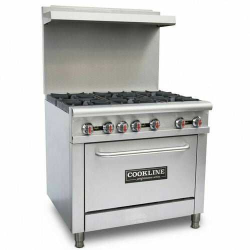 Cookline Restaurant Range, natural gas, 36"W, (6) 30,000 BTU cast iron open burners, standard oven with U-shape 31,000 BTU/hr burner, thermostat controlled, 250° to 550°F temperature range, thermal coupling safety valve, standby pilot, pull-out crumb tray, welded frame, stainless steel handle & oven door, kick plate, stainless steel front, sides, back riser & shelf, adjustable legs, 211,000 BTU, NSF, cETLus, ETL-Sanitation