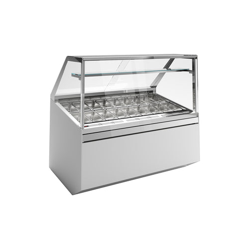Vertigo 3 Gelato/Ice Cream/Frozen Display Case, 43-11/16" x 44-3/8" x 59-1/16, holds (12) standard 5 liter metal pans (pans are not included), single front glass heated & downward opening, sides in laminated glass heated with mirror screen printing, N°1 shelf intermediate complete with lighting, bright aluminum profiles, no spot 3000°K led lighting, operator compartment with PET easy sliding, tank insulated with ecological polyurethane & covered in stainless steel, ventilated refrigeration, reverse cycle defrost, electronic control unit & digital temperature reader flush with the worktop, worktop in polished stainless steel, pre-arrangement for pans dim. 14-13/16" x 6 1/2 x 4-3/4 (360x165x120) or 14-13/16" x 9-13/16" x 3-1/8" (360x250x80mm) (not supplied) backlit ice cream flavor tags, supporting frame in galvanized steel with height adjustable stainless steel feet