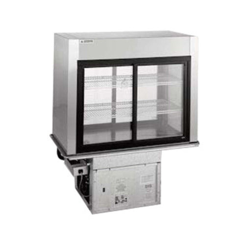 Refrigerated Display Case, drop-in, 43-1/2"W x 24"D x 50"H, pass-thru, self-contained refrigeration, 18/304 stainless steel top, self-closing sliding doors on customer & operator side, (2) adjustable plastic coated wire shelves, fluorescent lighting with separate on/off switch, forced air evaporator, internal thermometer, 20/304 stainless steel double-wall construction for interior & exterior, 41-3/4"W x 22-1/4"D cutout required, 1/2 HP, UL, UL EPH
