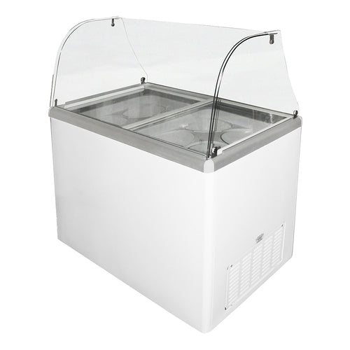 Ice Cream Dipping Cabinet, 47-1/2"W, 12.5 cu. ft. capacity, self-contained refrigeration, temperature range -15° to 5°, curved glass front, (8) 3 gallon working tub capacity, (2) sliding glass doors, can holders with spill guard, white exterior, casters (2 locking), R290 HC refrigerant, 1/4 HP, 115v/60/1-ph, 4.3 amps, cULus, UL-Sanitation. No interior lighting . ******NORMALLY STOCKED IN RENO, NV 89502 AND Plant City, FL 33565**********