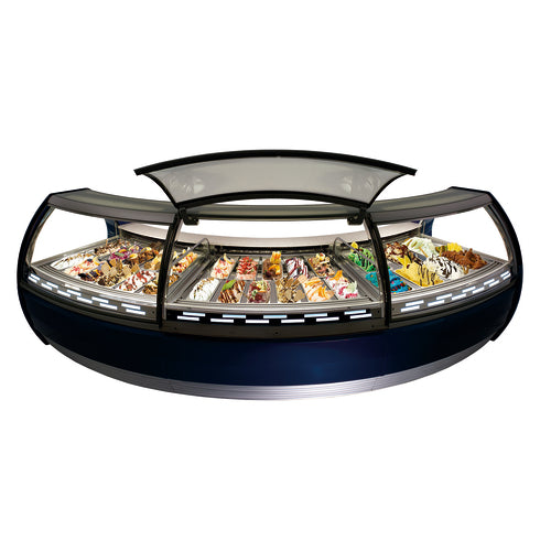 MTX-Series Gelato/Ice Cream Showcase/Display Case/Showcase, 63"W on customer side, 38"W on service side, 30° open angle, holds (11) 5 liter pans, hydraulic front glass opening, curved-tempered double pane heated glass, sliding rear doors, casters, 220v/60/1-ph, 10.0 amps, CE, ETL, ETL-Sanitation
