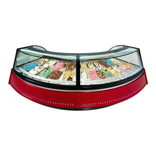P-Quadro Curved Gelato/Ice Cream Display Case/Showcase, 79"W on customer side, 45° angle, holds (14) 5 liter pans, curved front glass, rear doors, casters, 220v/60/1-ph, 10.0 amps, CE, ETL, ETL-Sanitation