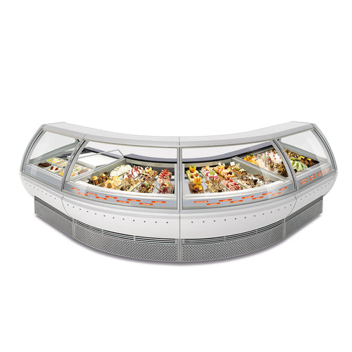 Q-Series Curved Gelato/ Ice Cream Display Case/Showcase, 63"W on customer side, 38"W on service side, 45° angle, holds (9) 5 liter pans, hydraulic front glass opening, curved-tempered double pane heated glass, sliding rear doors, automatic defrost cycle, casters, 220v/60/1-ph, 15.0 amps, CE, ETL, ETL-Sanitation