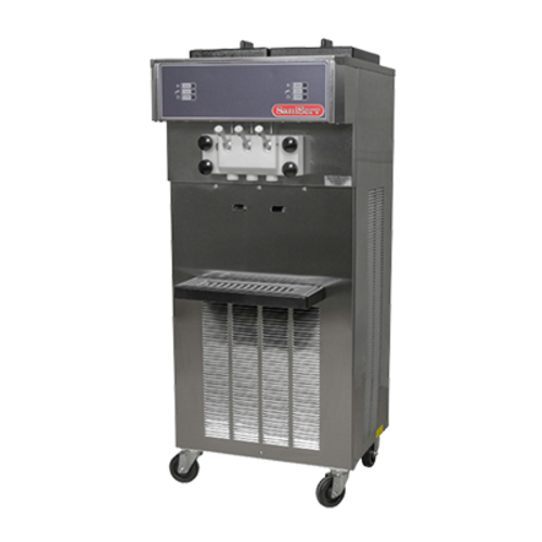 Soft Serve/Yogurt Twist Freezer, floor model, air or water cooled, self-contained refrigeration, 2 heads, 11 qt. mix capacity (per side), welded steel frame, stainless steel exterior, electronic consistency control, automatic audible/visual mix out, day/night switch, (2) 1 HP dasher, (1) 2 HP compressor, casters included, UL, cUL, NSF
