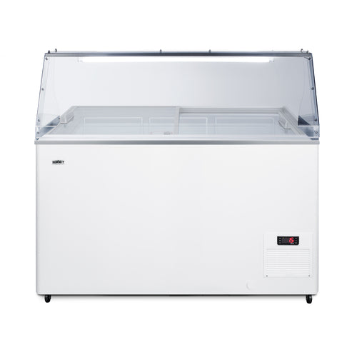 Display Case Dipping Cabinet, 43"W, 11.7 cu.ft. capacity, (6) 3 gallon tub display & (4) 3 gallon tub storage capacity, (2) tempered glass sliding locking lids, sneeze guard & light, digital thermostat, -13°F to +23°F temperature range, (3) epoxy-coated wire baskets with plastic lids, manual defrost, white steel interior & exterior, self contained side-mounted refrigeration, R290a Hydrocarbon refrigerant, 115v/60/1-ph, 7.2 amps, ULC, UL, UL-Sanitation