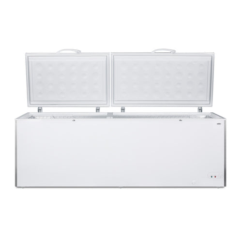 Chest Freezer, 91-1/4"W, 26.66 cu. ft. capacity, (2) lift-up locking lids with remain open feature, manual defrost, dial thermostat, -10°C to -26°C temperature range, (2) stainless steel front corner protectors, hammered aluminum interior, white exterior, (6) casters, R134a refrigerant, 115v/60/1-ph, 3.8 amps, UL-Sanitation, ULC, UL (Commercial)