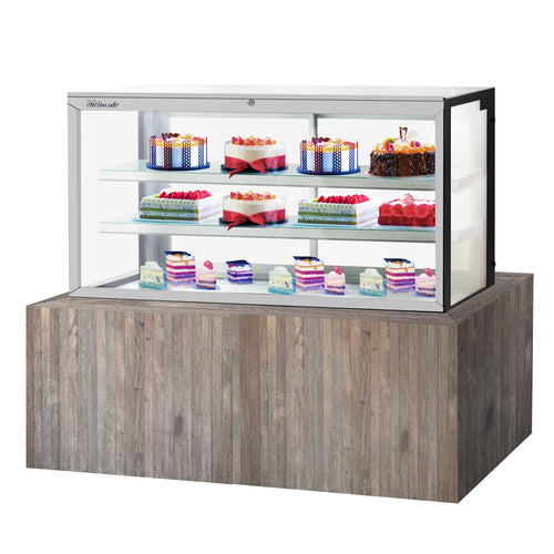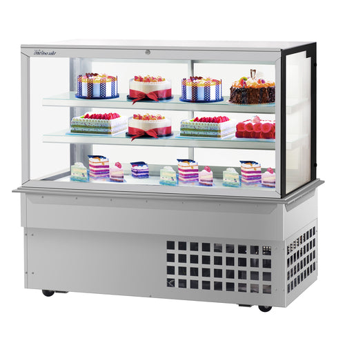 Drop-In Refrigerated Bakery Display Case, 61-3/4"W, 21.8 cu. ft. capacity, self-contained refrigeration with self-cleaning condenser, straight front tilt-out tempered glass, tempered glass side pannels, sliding rear doors, digital temperature controller, (2) adjustable tempered glass shelves with stainless steel front & back edges, LED interior lighting, stainless steel floor & airflow grille, 3" swivel casters (rear locking), R290 Hydrocarbon refrigerant, 3/4 HP, 115v/60/1-ph, 8.7 amps, cord with NEMA 5-15P, cETLus, ETL-Sanitation (Contact sales for lead time)