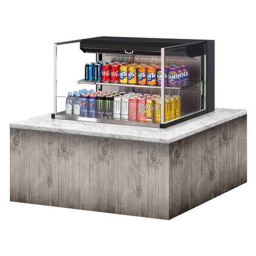 Drop-In Horizontal Open Display Case, low profile, 7.5 cu. ft. capacity, 35-7/8"W x 33"D x 44-1/4"H, self-contained refrigeration with self-cleaning condenser, (1) shelf + deck, tempered glass front shield & side walls, solar digital thermometer, digital electronic thermostat with defrost control, LED interior lighting, stainless steel interior, back wall & deck pan, specify exterior color, front air intake & rear air discharge, includes night cover, R290 Hydrocarbon refrigerant, (2) 3/4 HP, 115v/60/1ph, 11.3 amps, cord with NEMA 5-20P, CSA-Sanitation, cCSAus