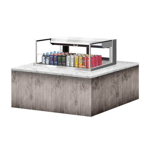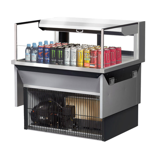 Drop-In Horizontal Open Display Case, low profile, 4.6 cu. ft. capacity, 35-7/8"W x 33"D x 38-3/8"H, self-contained refrigeration with self-cleaning condenser, deck only, tempered glass front shield & side walls, rear sliding glass doors, solar digital thermometer, digital electronic thermostat with defrost control, LED interior lighting, stainless steel interior, specify exterior color, front air intake & rear air discharge, includes night cover, R290 Hydrocarbon refrigerant, (2) 3/4 HP, 115v/60/1-ph, 11.3 amp, cord with NEMA 5-20P, CSA Sanitation, cCSAus