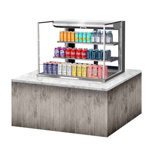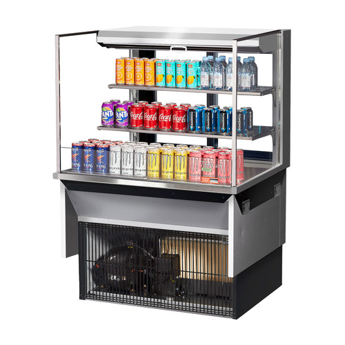 Drop-In Horizontal Open Display Case, low profile, 11.1 cu. ft. capacity, 35-7/8"W x 33"D x 53-1/8"H, self-contained refrigeration with self-cleaning condenser, (2) glass shelves + deck, tempered glass front shield & side walls, rear sliding glass doors, solar digital thermometer, digital electronic thermostat with defrost control, LED interior lighting, stainless steel interior, specify exterior color, front air intake & rear air discharge, includes night cover, R290 Hydrocarbon refrigerant, (2) 3/4 HP, 115v/60/1-ph, 11.3 amp, cord with NEMA 5-20P, CSA Sanitation, cCSAus