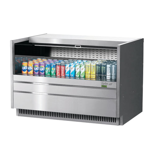 Drop-In Horizontal Open Display Case, low profile, 6.8 cu. ft. capacity, 48-1/4"W x 32-1/4"D x 32-1/2"H, self-cleaning condenser device, tempered glass front shield, LED interior lighting, solar powered digital thermometer, digital electronic thermostat with defrost control, solid side panels, standard back-guard improves airflow, stainless steel interior including back wall & deck pans, perforated interior back wall & open top, stainless steel exterior, night curtain, R290 Hydrocarbon refrigerant, 3/4 HP, 115v/60/1-ph, 7.5 amps, NEMA 5-15P, CSA Sanitation, cCSAus