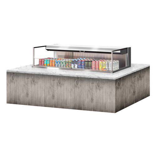 Drop-In Horizontal Open Display Case, low profile, 8.0 cu. ft. capacity, 59-7/8"W x 33"D x 37-3/4"H, self-contained refrigeration with self-cleaning condenser, deck only, tempered glass front shield & side walls, solar digital thermometer, digital electronic thermostat with defrost control, LED interior lighting, stainless steel interior, back wall & deck pan, specify exterior color, front air intake & rear air discharge, includes night cover, R290 Hydrocarbon refrigerant, (2) 3/4 HP, 115v/60/1-ph, 15.0 amp, cord with NEMA 5-20P, CSA Sanitation, cCSAus