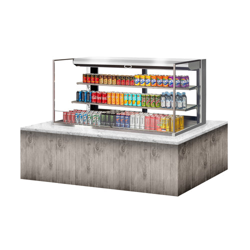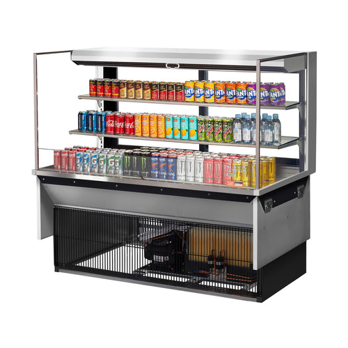Drop-In Horizontal Open Display Case, low profile, 19.3 cu. ft. capacity, 59-7/8"W x 33"D x 53-1/8"H, self-contained refrigeration with self-cleaning condenser, (2) glass shelves + deck, tempered glass front shield & side walls, rear sliding glass doors, solar digital thermometer, digital electronic thermostat with defrost control, LED interior lighting, stainless steel interior, specify exterior color, front air intake & rear air discharge, includes night cover, R290 Hydrocarbon refrigerant, (2) 3/4 HP, 115v/60/1-ph, 15.0 amp, cord with NEMA 5-20P, CSA Sanitation, cCSAus
