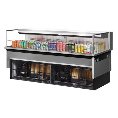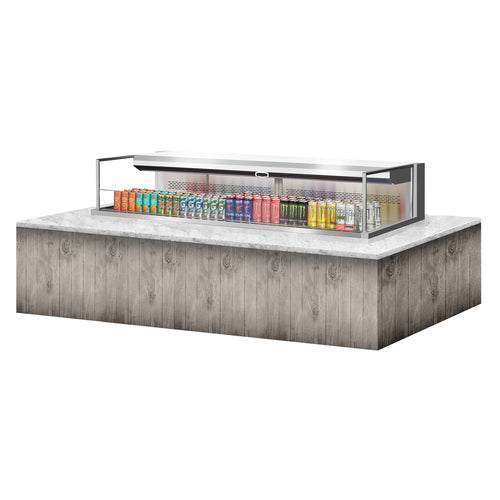 Drop-In Horizontal Open Display Case, low profile, 9.7 cu. ft. capacity, 71-7/8"W x 33"D x 37-3/4"H, self-contained refrigeration with self-cleaning condenser, deck only, tempered glass front shield & side walls, solar digital thermometer, digital electronic thermostat with defrost control, LED interior lighting, stainless steel interior, back wall & deck pan, specify exterior color, front air intake & rear air discharge, includes night cover, R290 Hydrocarbon refrigerant, (4) 3/4 HP, 220v/60/1-ph, 13.0 amps, cord with NEMA 6-20P, CSA Sanitation, cCSAus