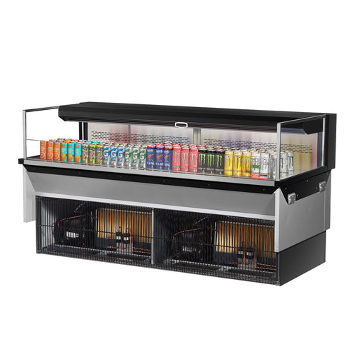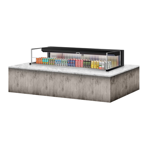 Drop-In Horizontal Open Display Case, low profile, 9.7 cu. ft. capacity, 71-7/8"W x 33"D x 37-3/4"H, self-contained refrigeration with self-cleaning condenser, deck only, tempered glass front shield & side walls, solar digital thermometer, digital electronic thermostat with defrost control, LED interior lighting, stainless steel interior, back wall & deck pan, specify exterior color, front air intake & rear air discharge, includes night cover, R290 Hydrocarbon refrigerant, (4) 3/4 HP, 220v/60/1ph, 13.0 amps, cord with NEMA 6-20P, CSA-Sanitation, cCSAus
